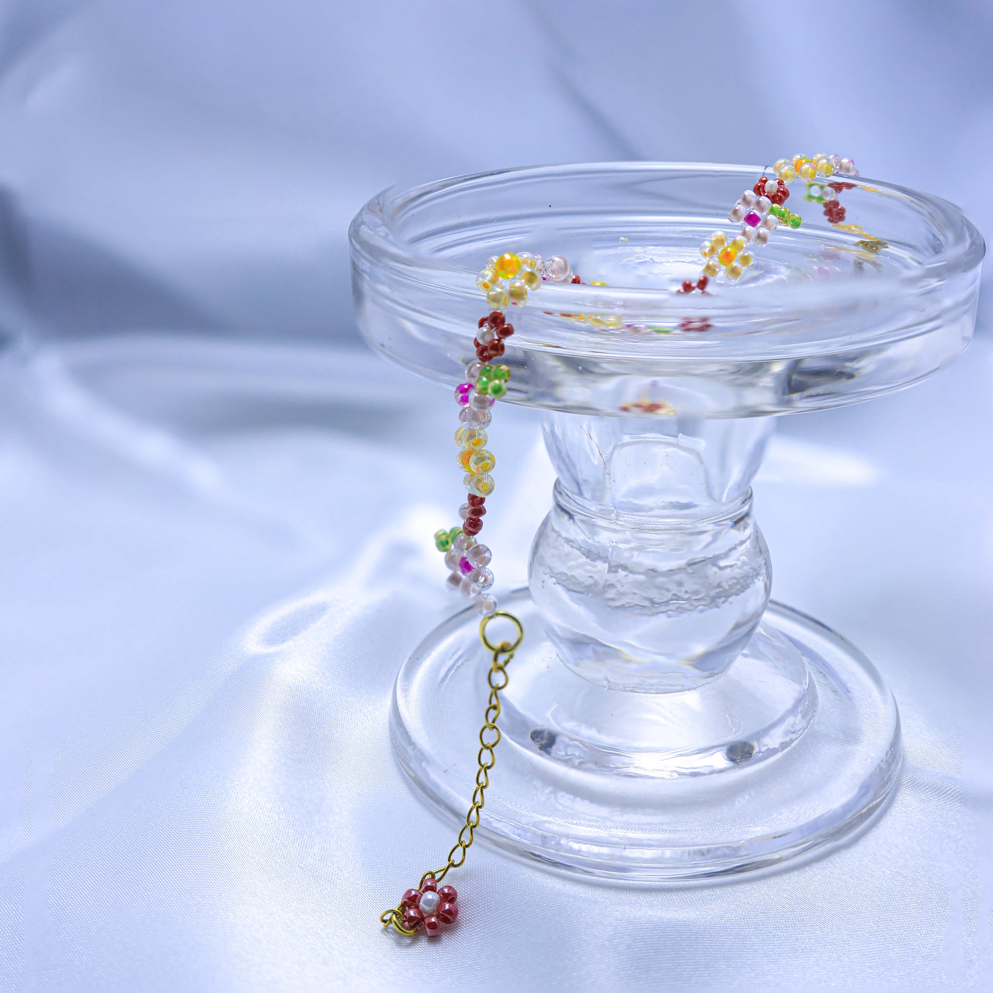 Creation story: Inspired by the vibrant beauty of a summer garden in full bloom, this bracelet bursts with playful colors and delicate flower motifs. Each glass bead is carefully selected and hand-strung to form tiny blossoms in shades of sunny yellow, cherry red, lush green, and joyful pink—like carrying a bouquet on your wrist.