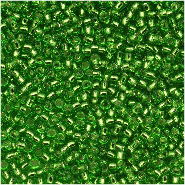 15/0 (2.1mm) seed beads in color "Silver Lined Peridot" (Color Code: #27). Transparent Peridot colored beads, lined with metallic silver.